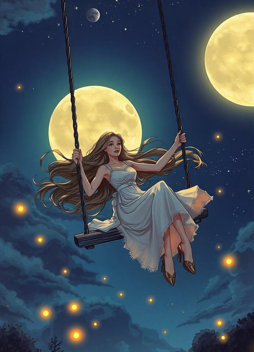 A woman with long brown hair is sitting on a swing, swinging under two full moons in a night sky with many stars and fireflies.
