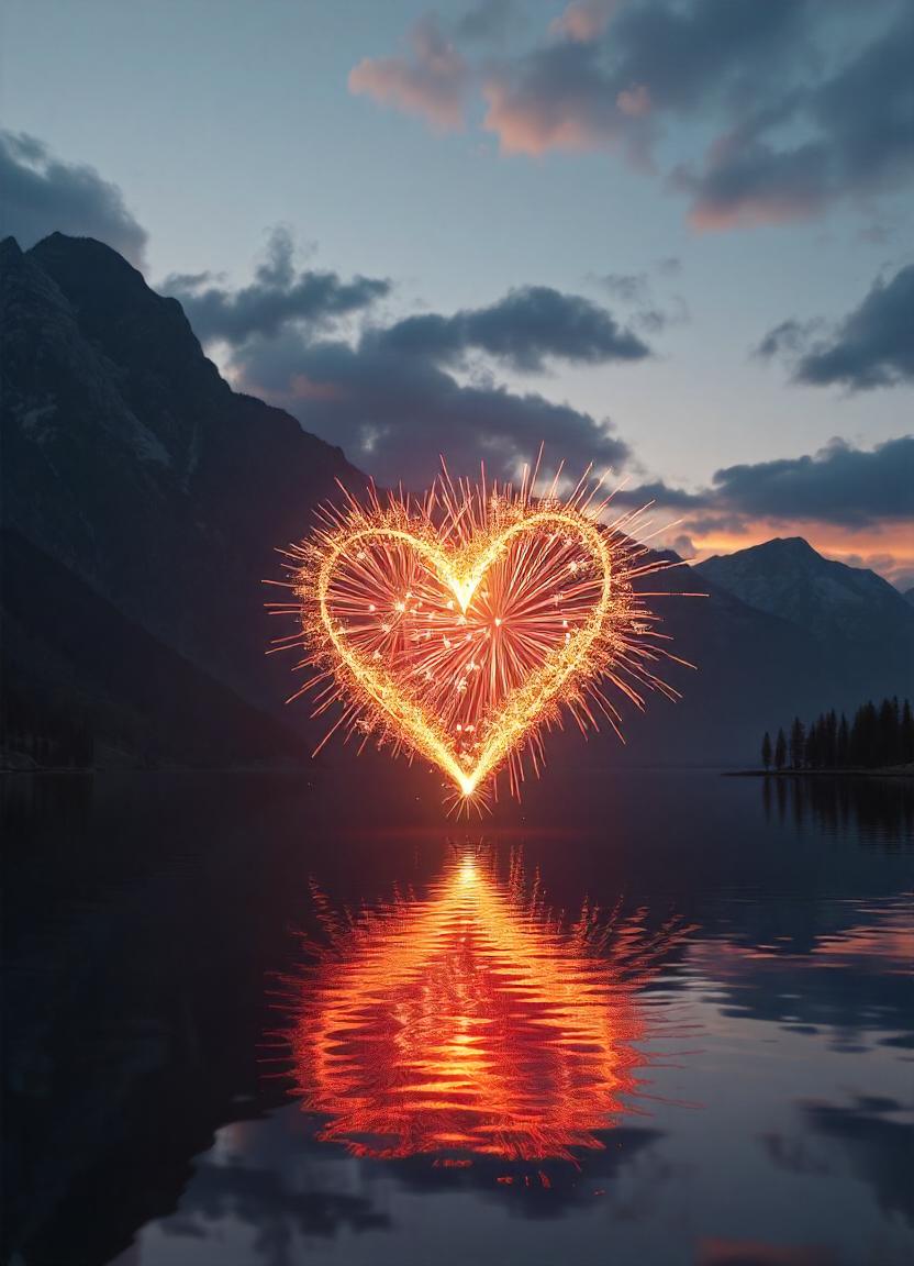 beautiful, calm, celebration, clouds, display, dusk, fireworks, heart, lake, love, mountains, nature, night, reflection, romantic, scenic, sky, still, sunset, water