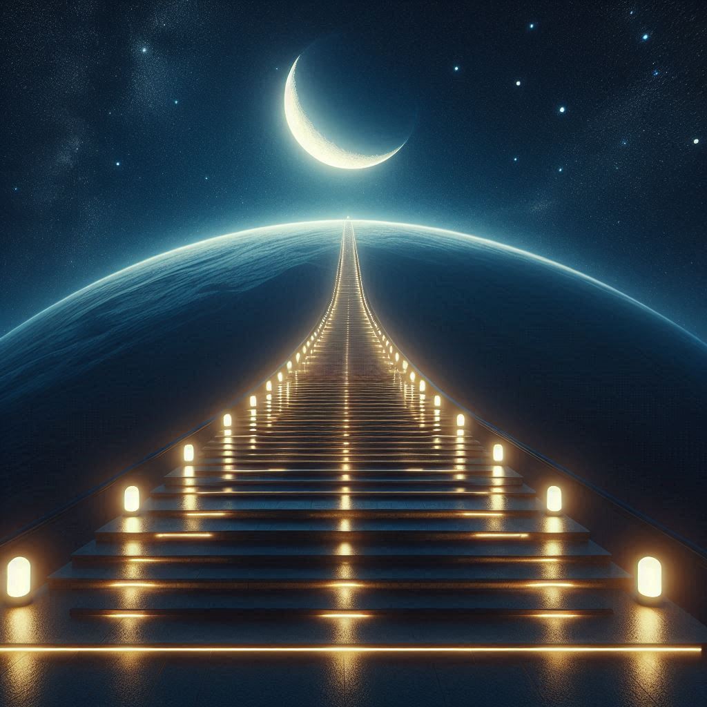 A long, illuminated stairway ascends to the heavens, passing through a dark blue sky with a crescent moon and scattered stars.