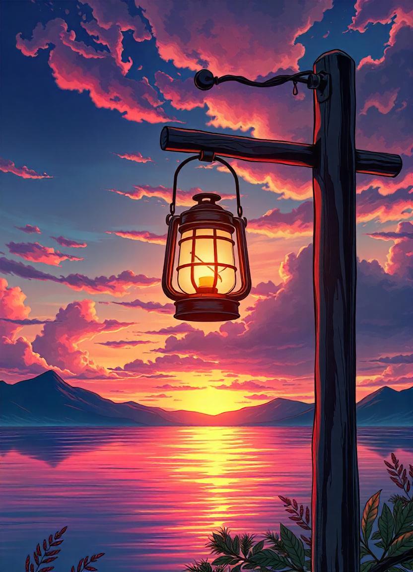 A lantern hangs from a wooden post against a backdrop of a vibrant sunset over a still lake