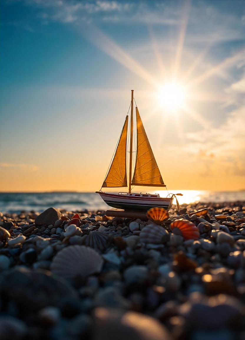A small sailboat with a yellow sail sits on a beach of pebbles and seashells. The sun is setting behind the boat, casting a golden light on the scene.