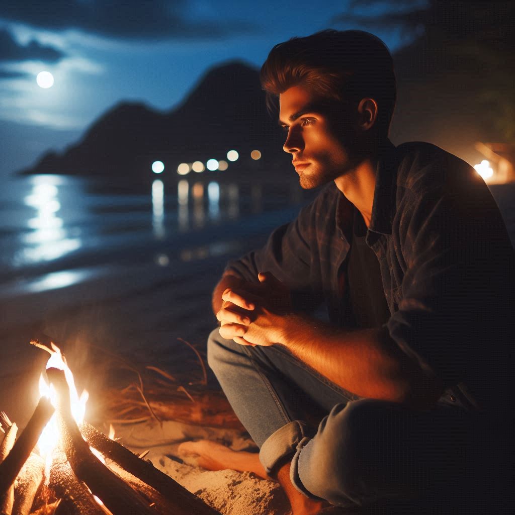 A man is sitting on the beach in front of a bonfire. He is looking out at the ocean, which is lit by the moon and a few distant lights.