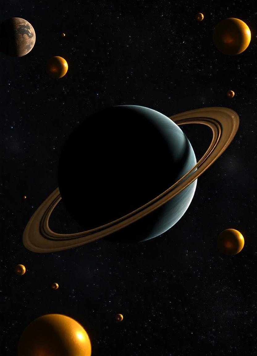 A dark blue ringed planet with gold rings is in a field of stars. Several smaller, golden planets are scattered around the ringed planet.