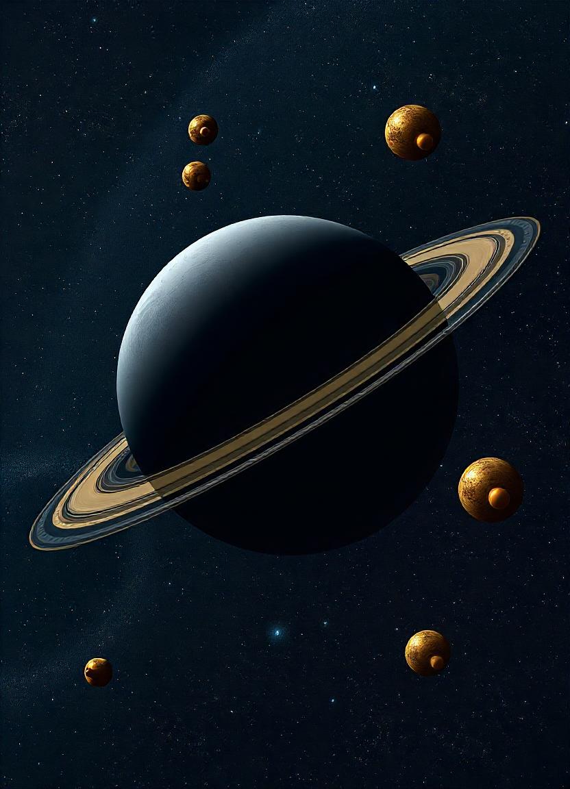 A large planet with a ring system, likely Saturn, is shown in space with several small, golden moons orbiting it