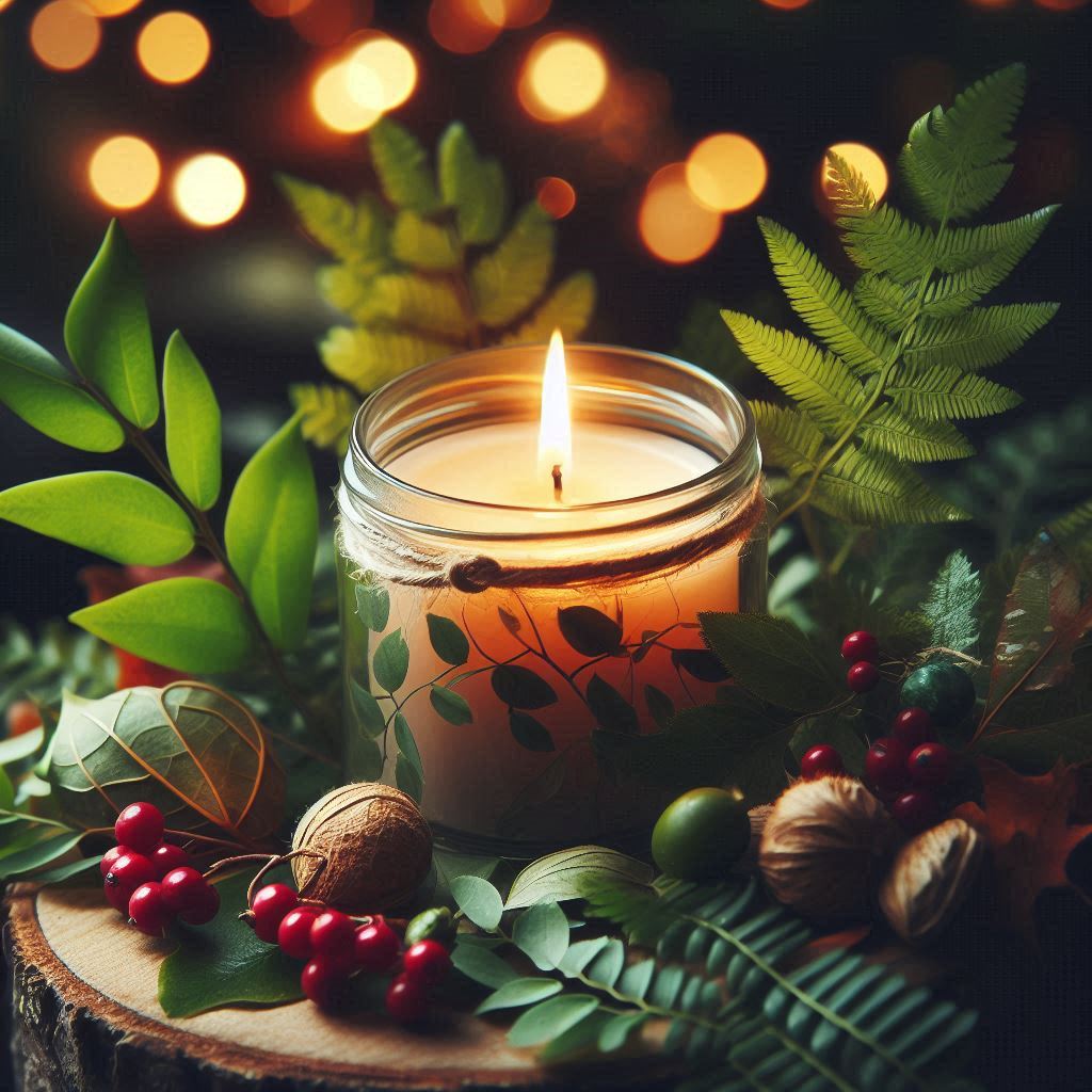 A candle in a glass jar with a leafy design burns brightly on a wooden surface surrounded by greenery, berries, and nuts