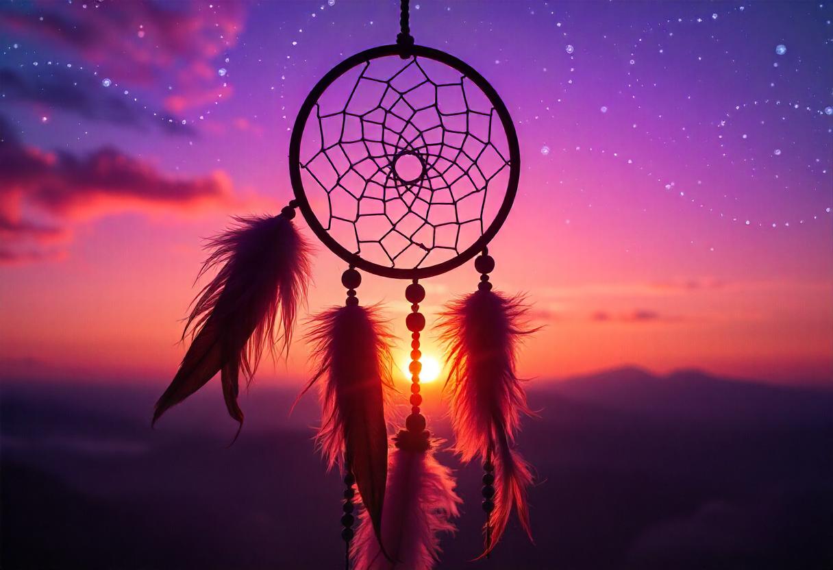 A dreamcatcher with feathers hangs in the foreground, while a colorful sunset with clouds and stars is visible in the background.
