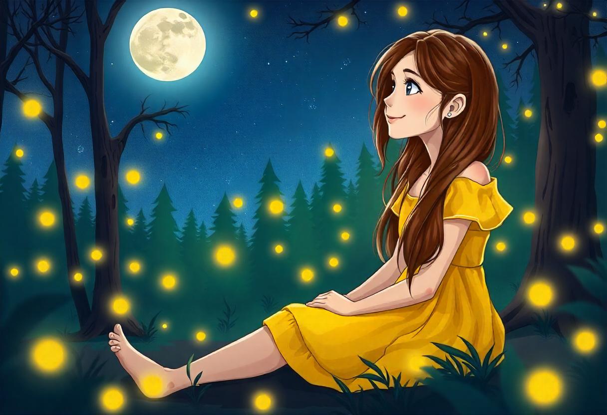 art, artwork, digital, dress, fireflies, forest, girl, grass, illustration, moon, nature, night, outdoors, peaceful, sitting, stars, trees, watching, woman, yellow
