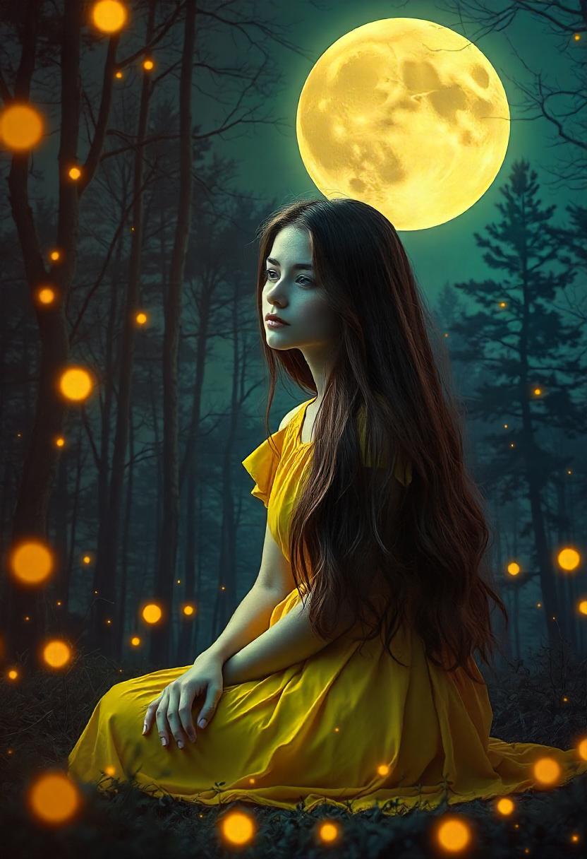 beautiful, dark, dress, fantasy, fireflies, forest, full, glowing, ground, large, magical, moon, moonlight, nature, night, orbs, sitting, trees, woman, yellow
