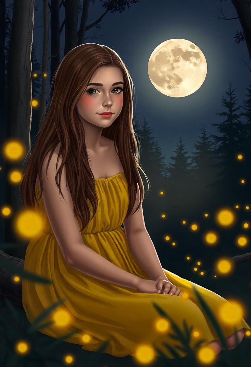 brown, dark, dreamy, dress, fireflies, forest, full, glow, hair, light, magical, moon, nature, night, sitting, sky, trees, whimsical, woman, yellow
