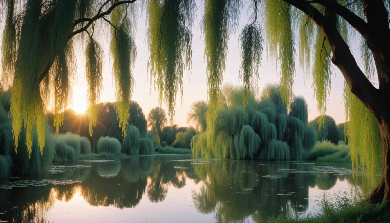A large willow tree frames a pond with its long, weeping branches. The sun is setting, casting a golden glow over the water and surrounding greenery.