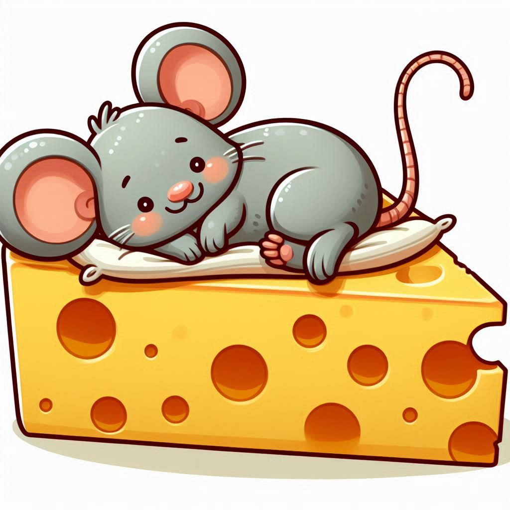 A cartoon mouse with large ears and a pink nose is lying on a pillow, sleeping on a large wedge of Swiss cheese.