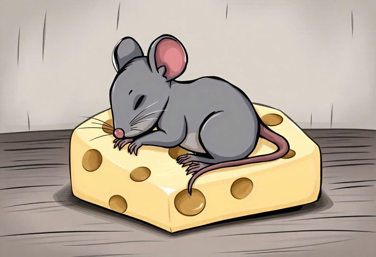 animal, block, cartoon, cheese, cute, dream, floor, food, funny, gray, holes, illustration, large, mouse, pink, rodent, sleeping, snack, wooden, yellow