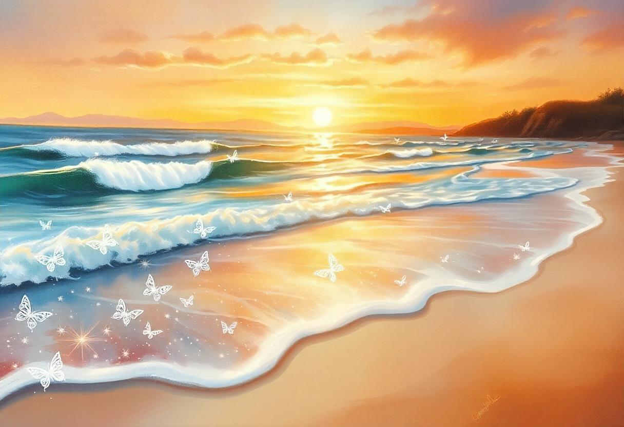 beach, blue, butterflies, calm, coast, fly, golden, horizon, nature, ocean, peace, sand, shoreline, sky, summer, sunset, tropical, water, waves, white