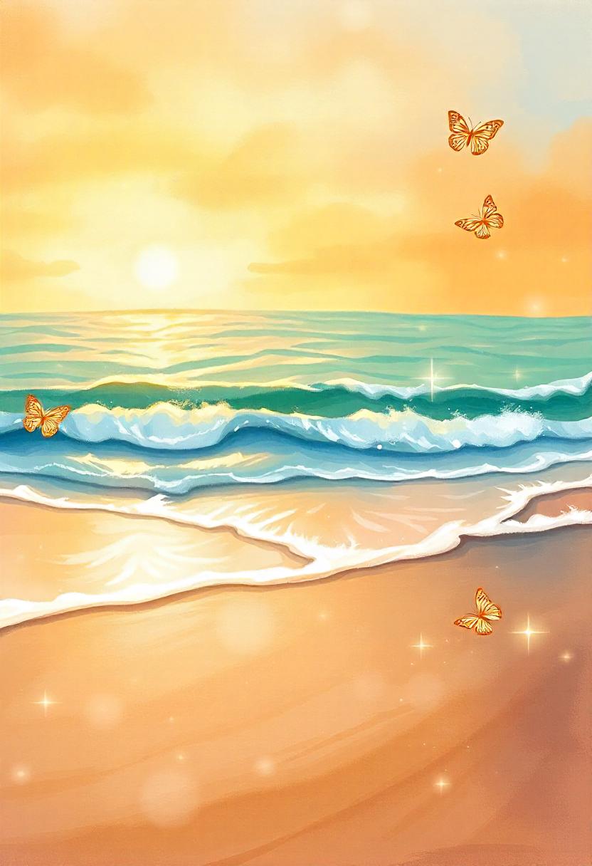art, beach, beauty, butterflies, digital, golden, illustration, nature, ocean, peace, relax, sand, shore, sky, summer, sunset, travel, tropical, vacation, waves