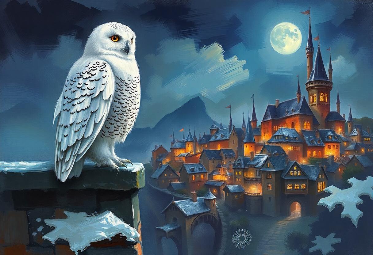 animal, bird, castle, city, cityscape, fairytale, fantasy, landscape, magical, medieval, moon, night, nocturnal, owl, perch, rooftop, snow, snowy, watch, winter