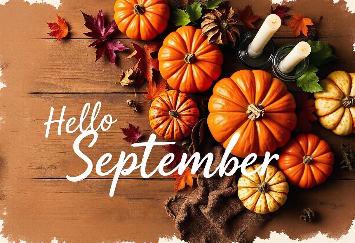 A wooden table with a variety of pumpkins, leaves, and candles in the center. The words Hello September are written in white on the table.
