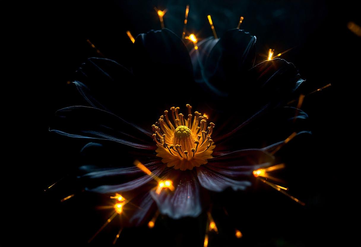 A black flower glows with tiny sparks