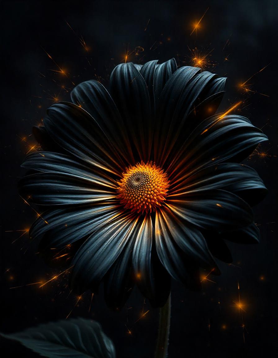 A black flower with a golden center blooms bright