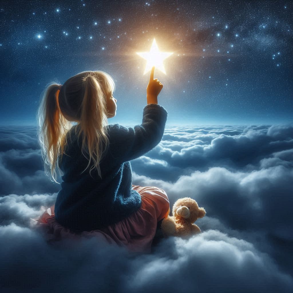 bear, bright, child, childhood, clouds, dream, faith, fantasy, future, girl, hope, imagination, magical, night, pointing, shining, sky, star, teddy, wonder