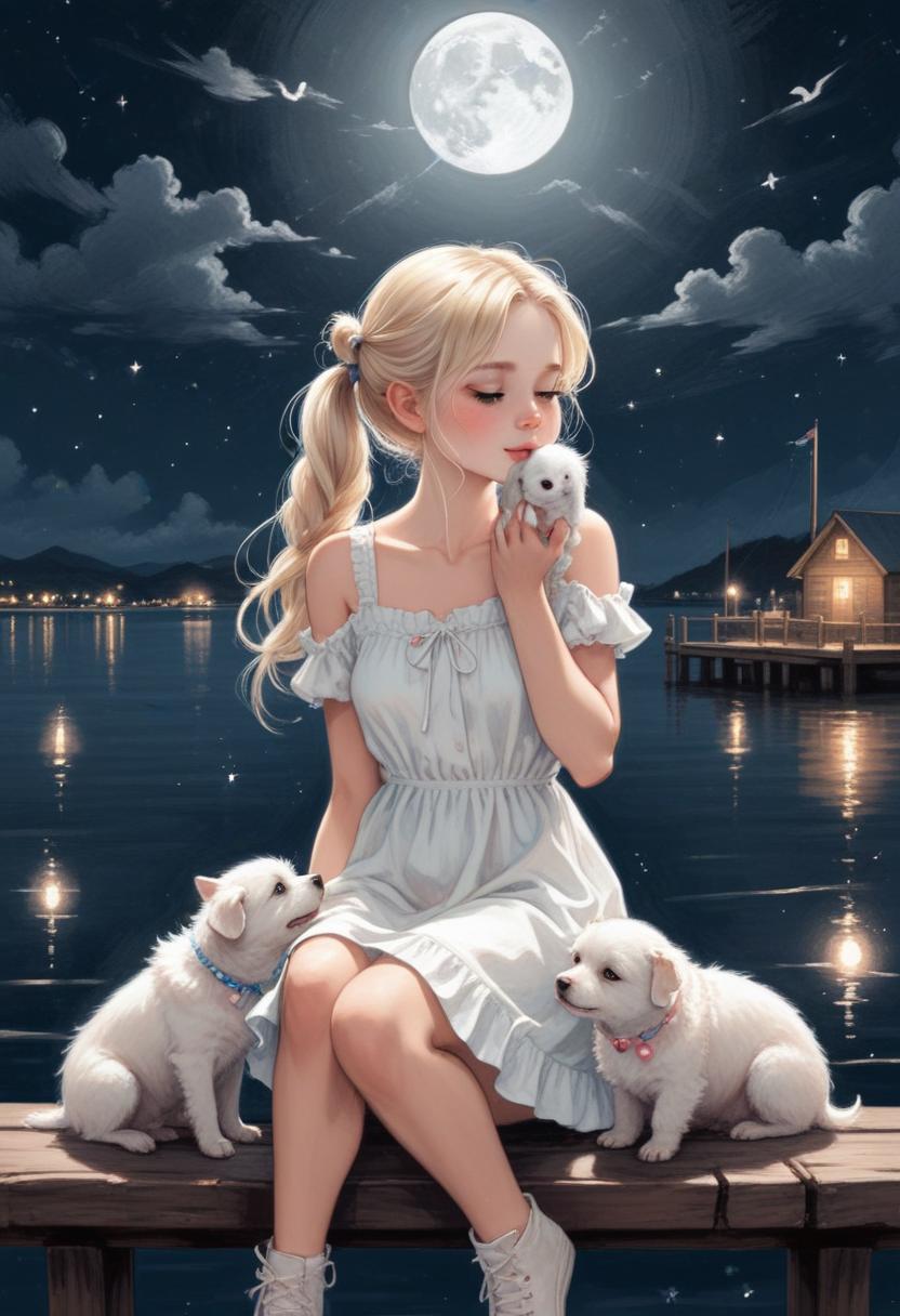 blonde, dock, dog, dress, full, girl, house, lake, lights, moon, night, pet, pier, puppies, rabbit, sky, stars, water, white, woman