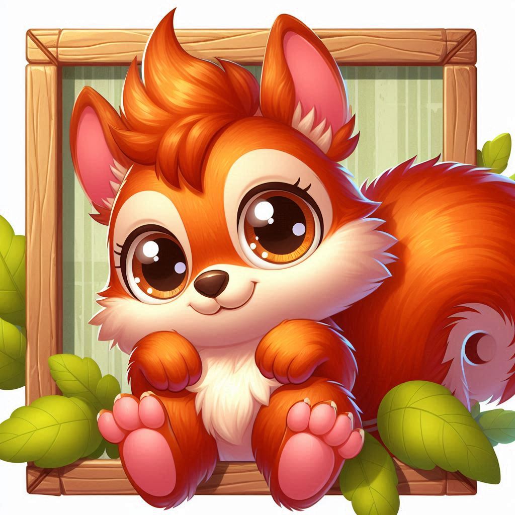 A cartoon squirrel with large eyes sits with its paws folded in a wooden frame.