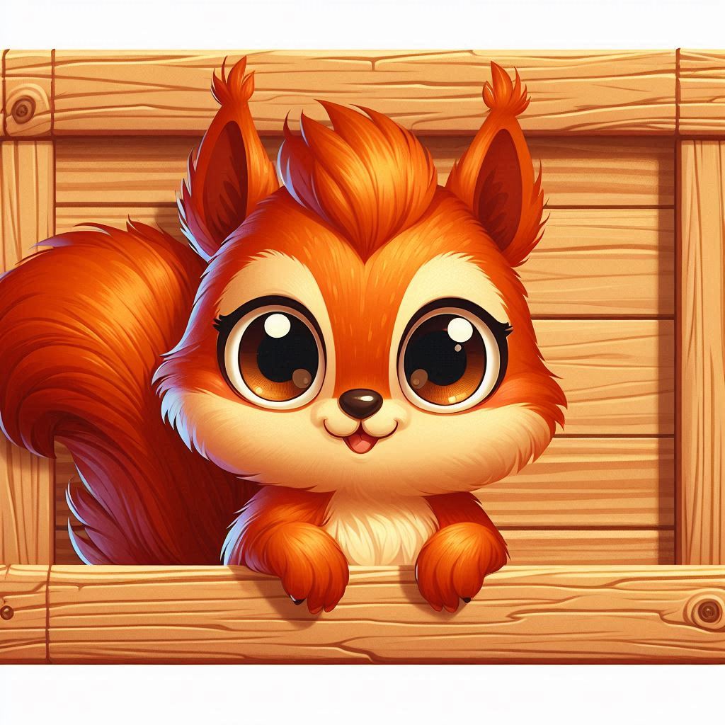 A cartoon squirrel with large eyes and a fluffy tail looks out of a wooden box.