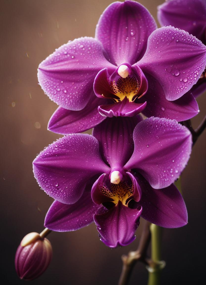 beauty, bloom, blossoms, botany, bud, delicate, dew, drops, floral, flower, macro, nature, orchid, petals, plant, purple, stem, tropical, vibrant, water