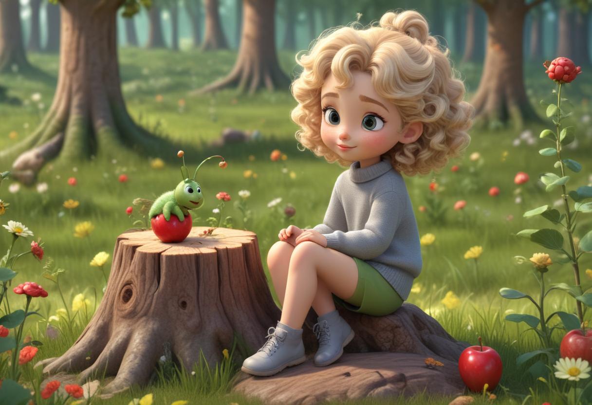 apple, blonde, blue, bug, cartoon, curly, cute, flower, forest, girl, grass, green, hair, illustration, nature, red, shorts, stump, sweater, tree
