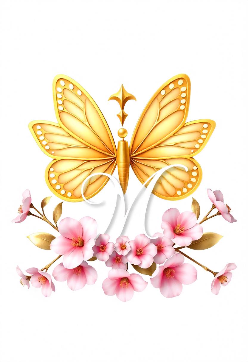 A golden butterfly with intricate details sits atop a letter M surrounded by pink flowers with gold accents.