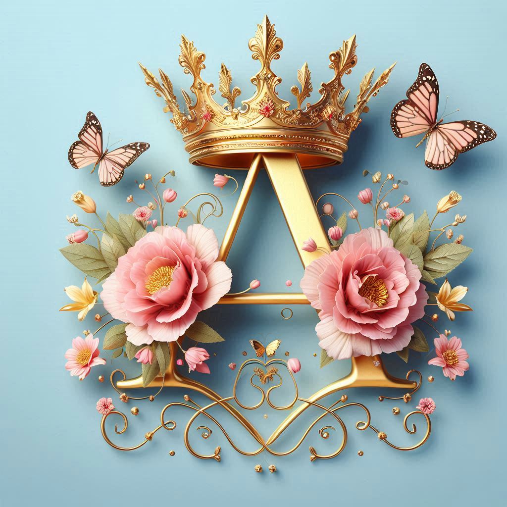 alphabet, art, background, blue, butterflies, butterfly, crown, design, floral, flower, flowers, gold, golden, graphic, illustration, letter, pink, rose, royal, typography