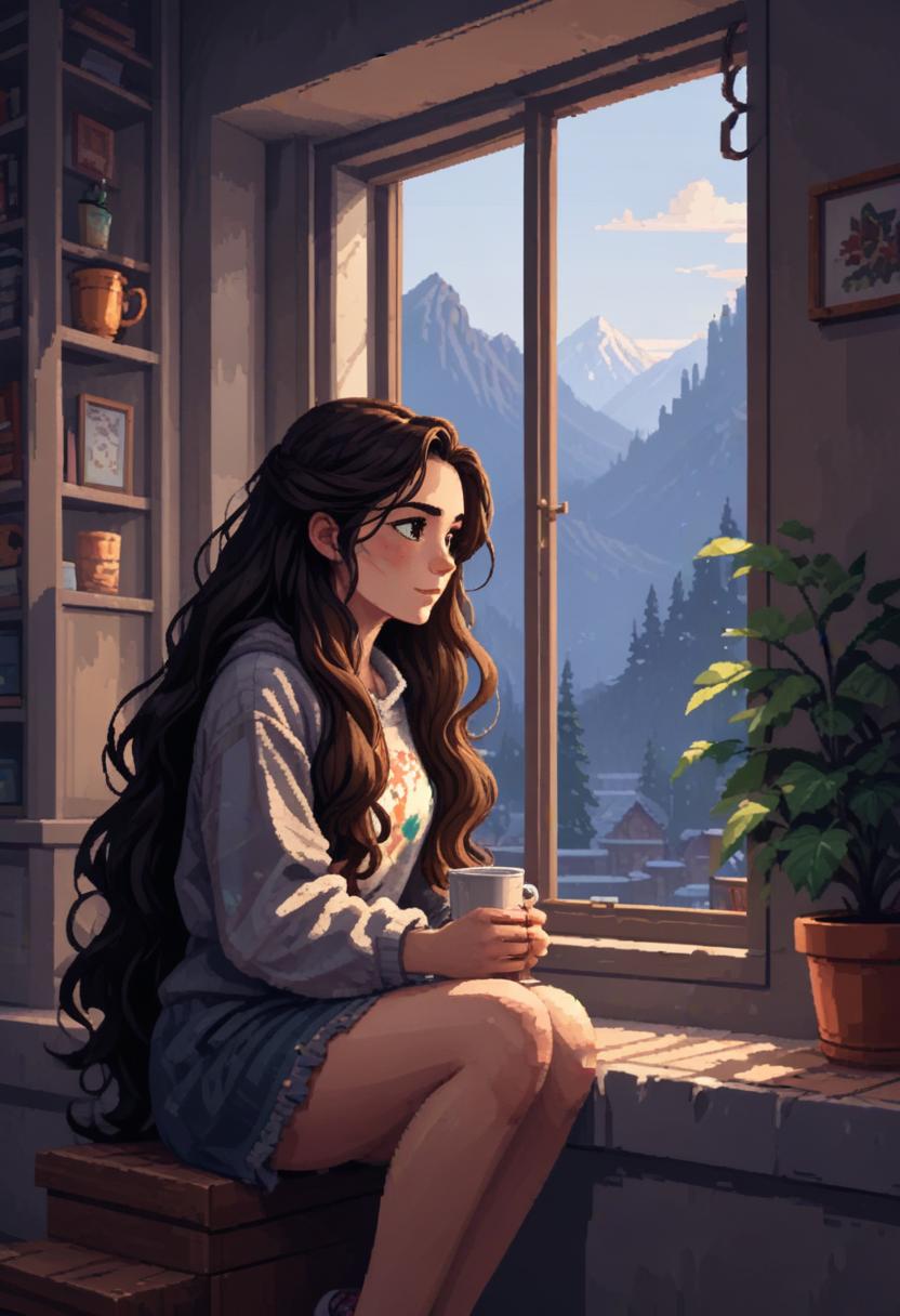A woman with long brown hair sits by a window, looking out at a view of mountains and a small town. She is holding a white mug in her hands.