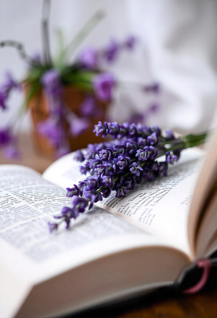 bloom, blossom, book, calm, decor, floral, flower, home, lavender, life, nature, open, pages, peace, purple, quiet, reading, relax, sprig, still