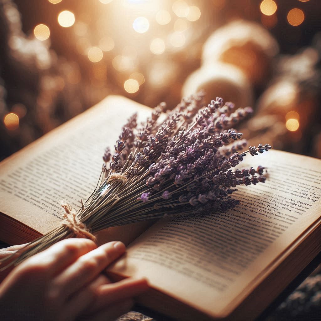 book, bouquet, cozy, dried, flowers, hand, holding, home, lavender, light, old, open, pages, peaceful, quiet, reading, relaxing, soft, vintage, warm