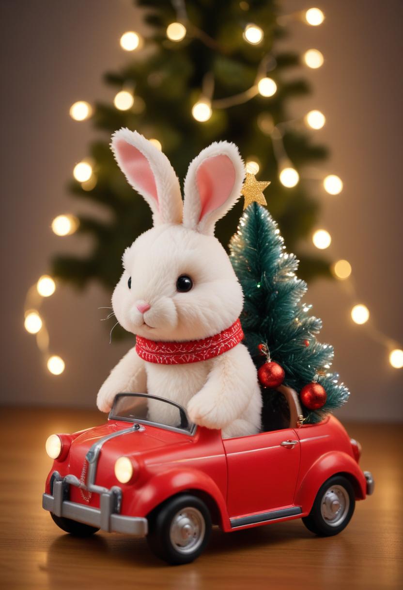 adorable, bunny, car, celebration, christmas, cute, december, festive, gift, holiday, joy, lights, ornaments, plush, present, rabbit, red, toy, tree, winter