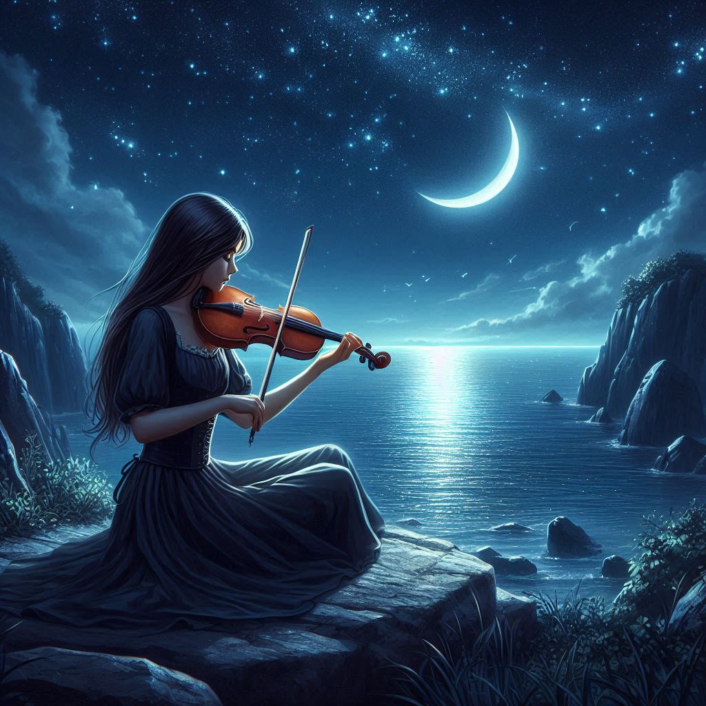 A woman sits on a rock overlooking the ocean, playing a violin under a crescent moon. Stars shine brightly in the night sky.