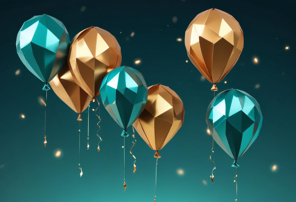 A group of gold and teal geometric balloons float in the air against a teal background. They have strings with gold confetti falling around them.