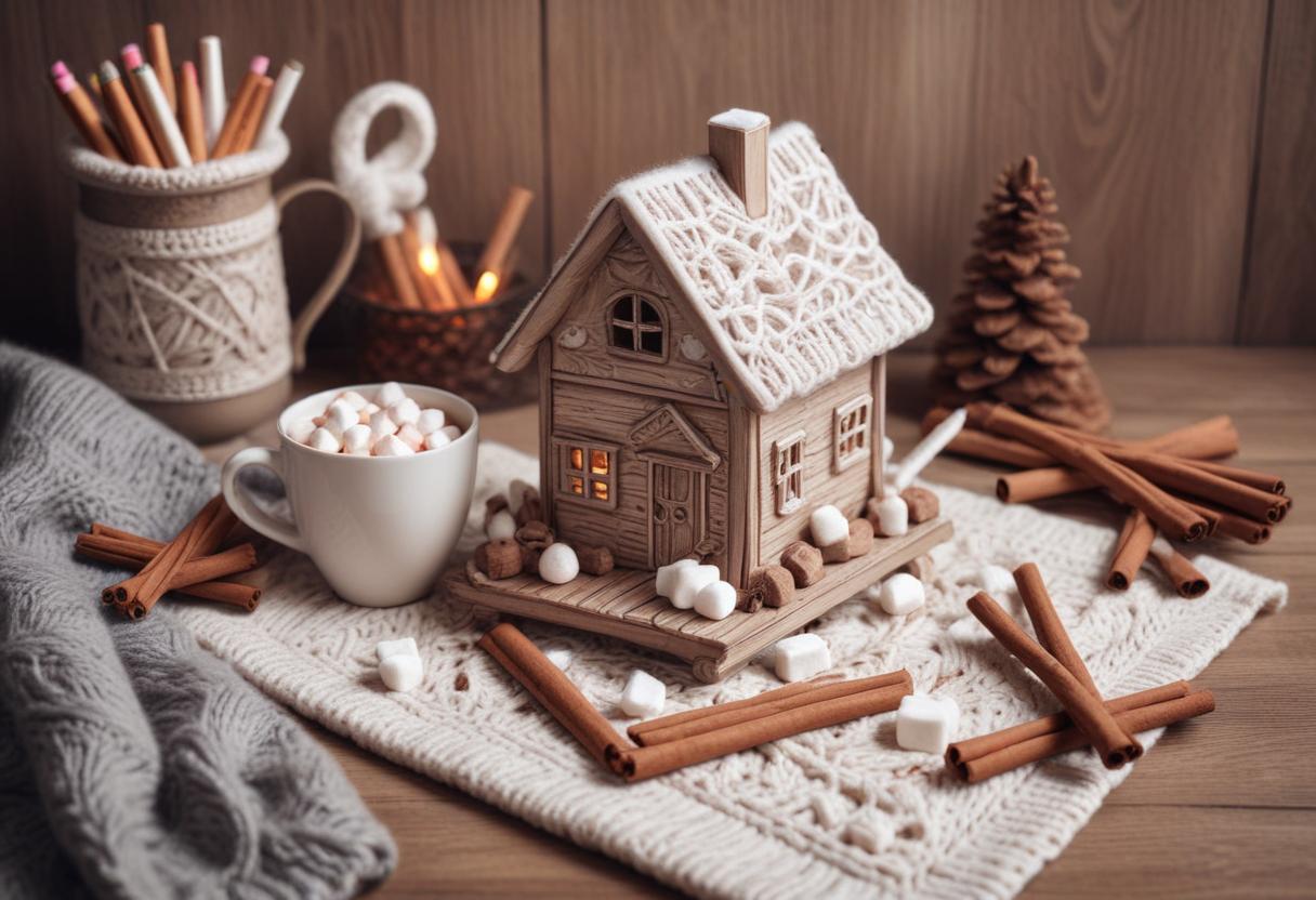 A rustic wooden table is set with a white knitted placemat, cinnamon sticks, a miniature house, and a mug of hot chocolate with marshmallows.