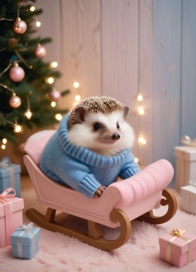 adorable, animal, blue, christmas, cozy, cute, december, decoration, festive, gift, hedgehog, holiday, lights, pink, present, season, sleigh, sweater, tree, winter