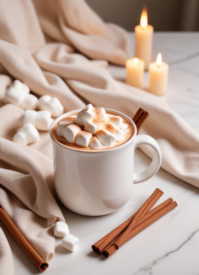 beverage, candles, chocolate, cinnamon, cocoa, cozy, drink, fall, holiday, hot, marble, marshmallows, mug, relaxation, sweet, table, treat, warm, white, winter
