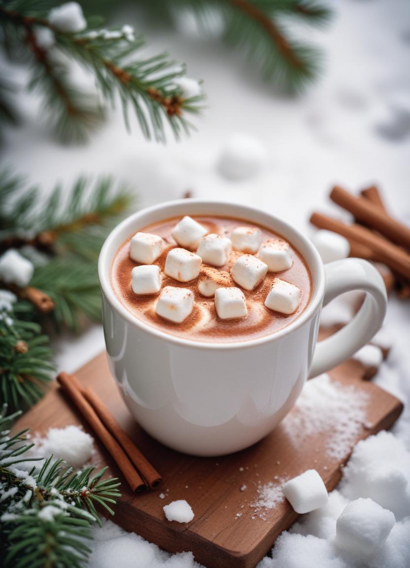 beverage, chocolate, christmas, cinnamon, cocoa, cozy, delicious, drink, evergreen, festive, holiday, hot, marshmallows, mug, snow, sweet, treat, warm, white, winter
