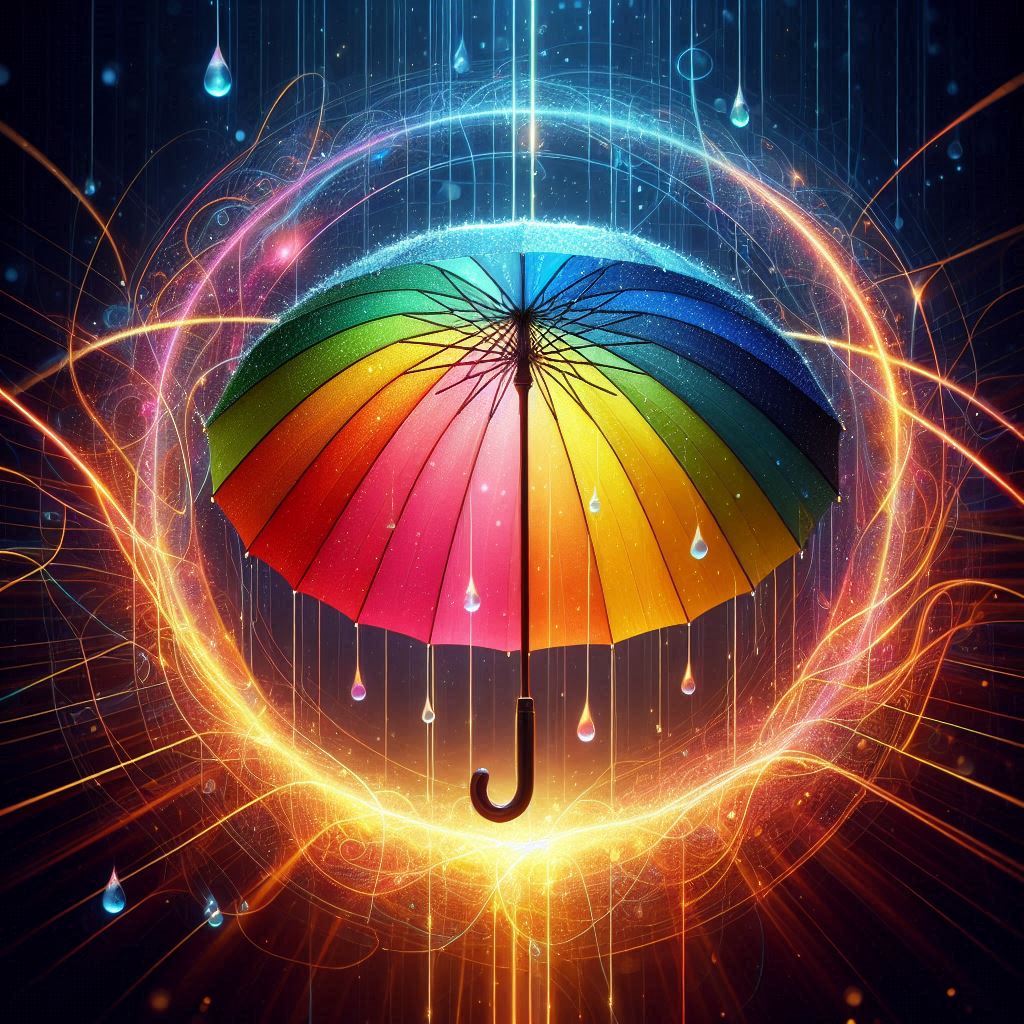 abstract, art, bright, colorful, cosmic, digital, dripping, energy, ethereal, fantasy, futuristic, glowing, golden, light, magical, rainbow, raindrops, swirling, umbrella, vibrant