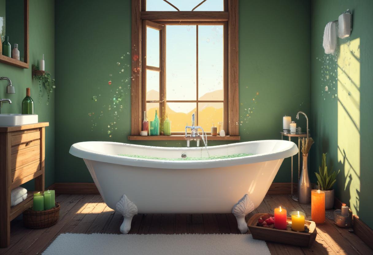 bathroom, bathtub, candles, claw, decoration, design, feet, floor, green, home, interior, luxury, relaxing, spa, sunlight, tub, walls, water, window, wood