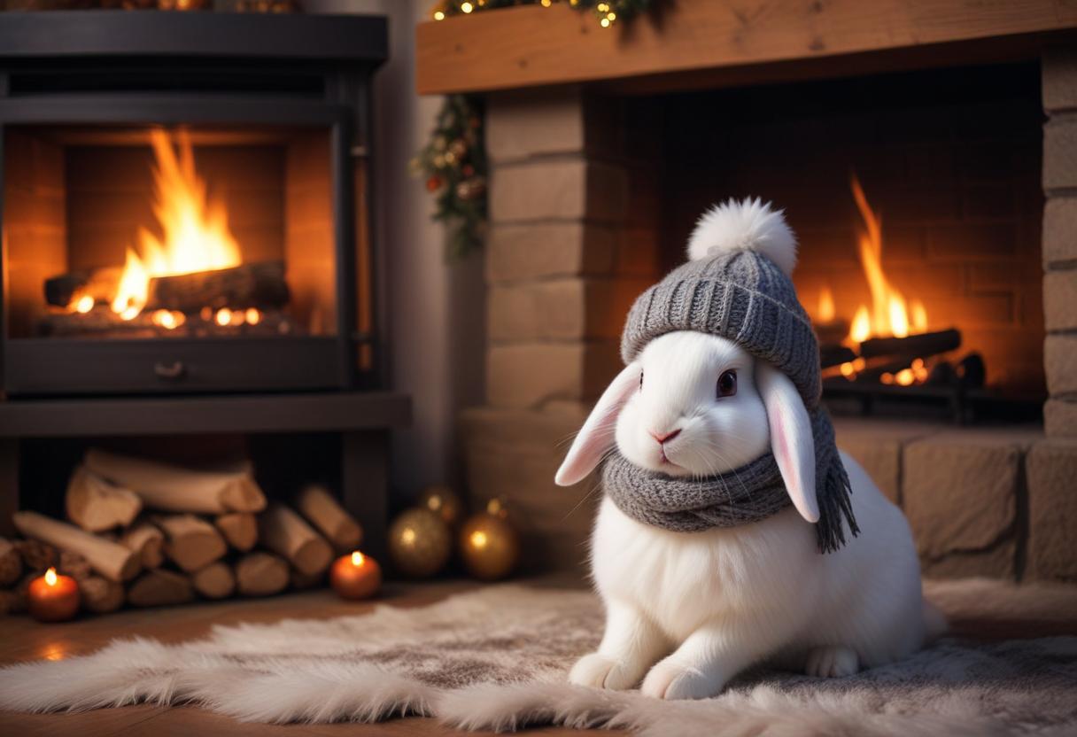 animal, burning, candle, christmas, cozy, cute, decor, fire, fireplace, hat, holiday, home, log, pet, rabbit, rug, scarf, warm, winter, wood
