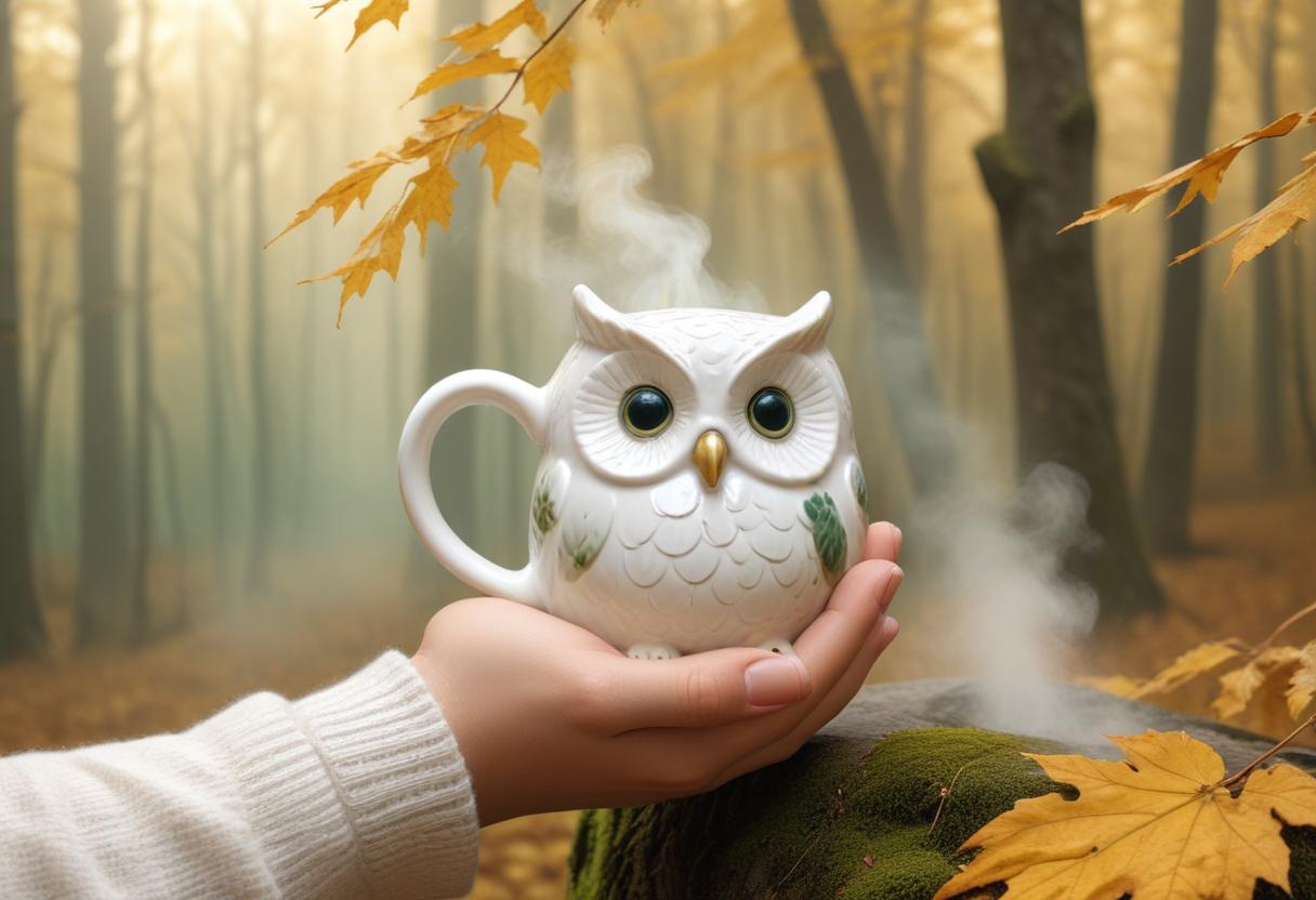 autumn, beverage, coffee, cup, drink, fall, forest, hand, holding, hot, leaves, mug, nature, owl, setting, steam, tea, white, woodland, yellow