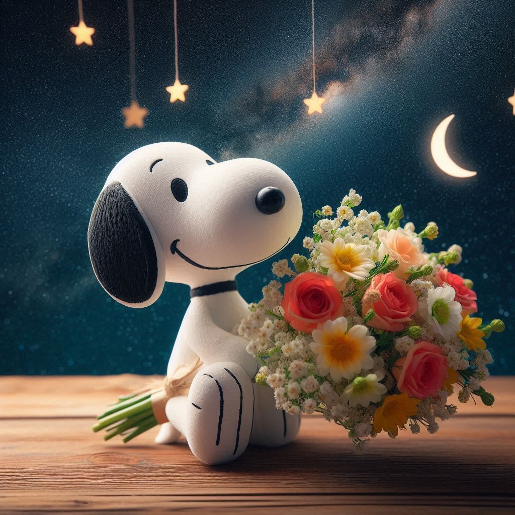 Snoopy holds a bouquet of flowers under a night sky