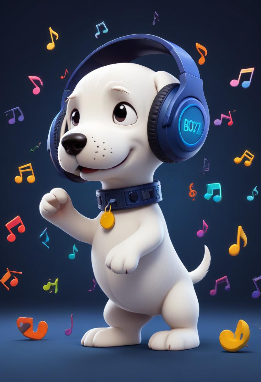 A white puppy with blue headphones dances to music, with colorful music notes around it.