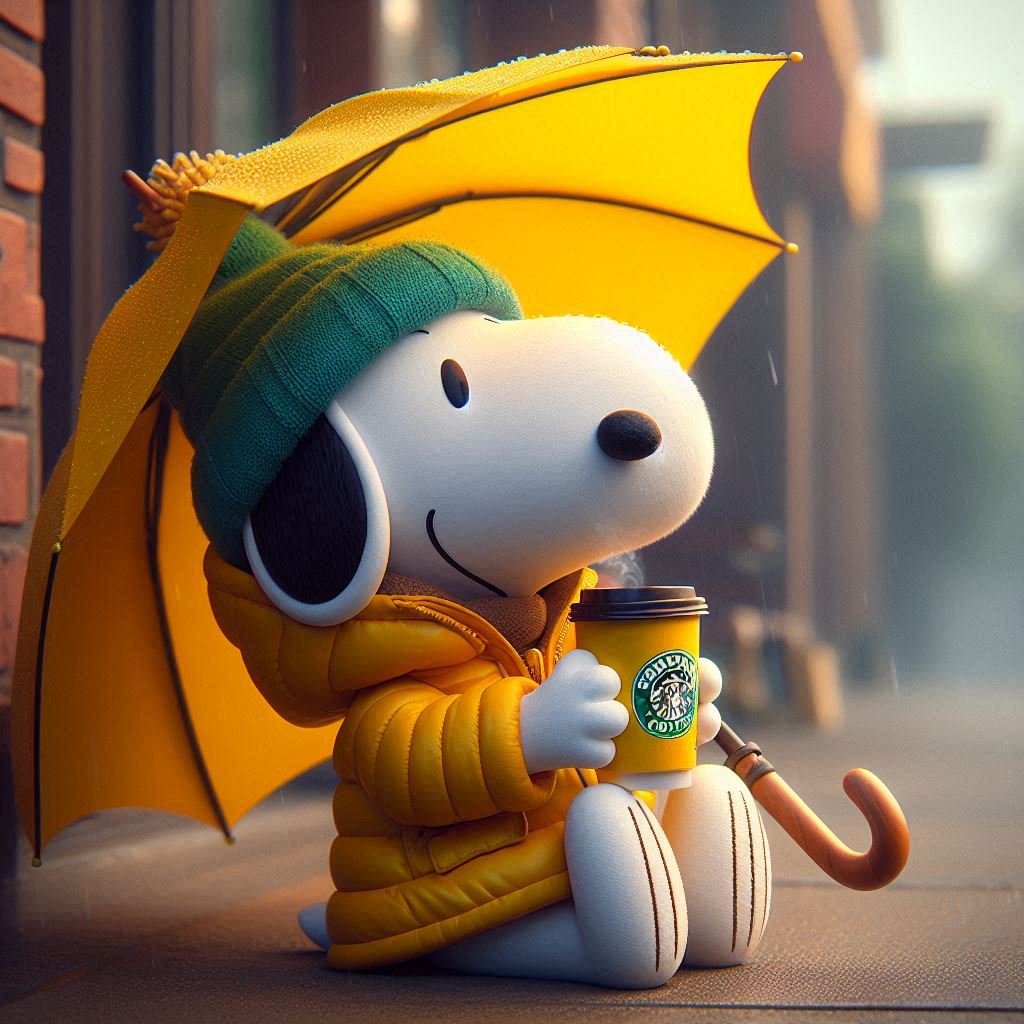 beanie, beverage, cartoon, character, city, coffee, cup, cute, dog, green, holding, rain, raincoat, sidewalk, sitting, smiling, steaming, umbrella, warmth, yellow