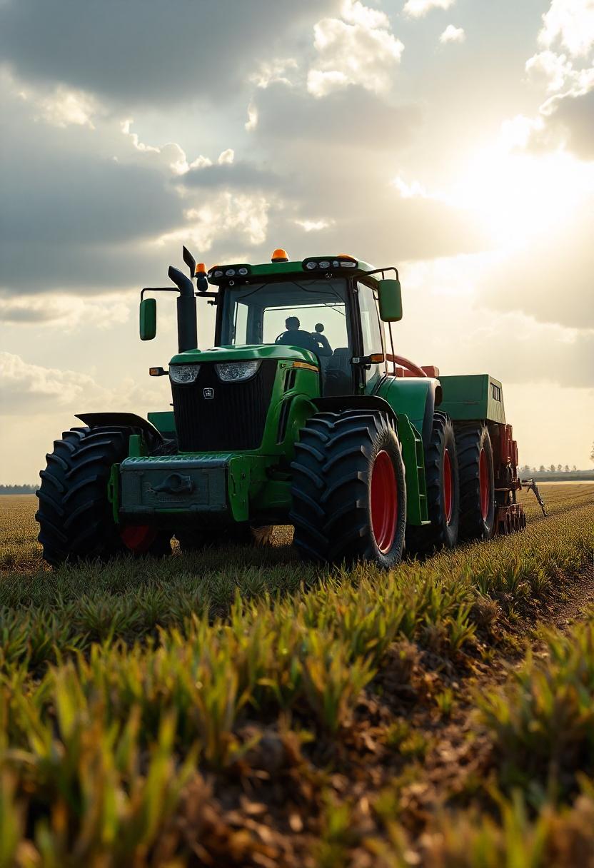 agriculture, cloudy, day, driver, equipment, evening, farm, farming, field, green, landscape, large, machinery, nature, outdoor, plow, rural, sky, sunset, tractor