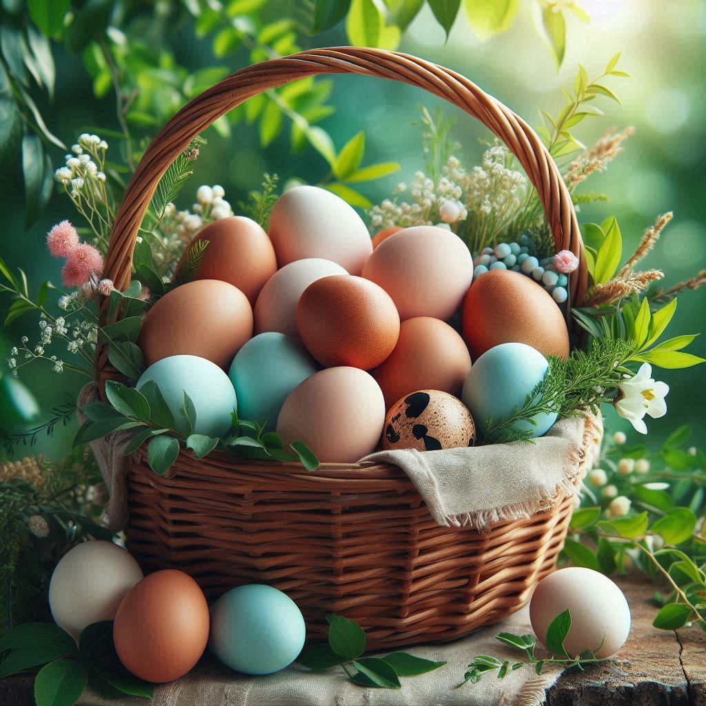A full wicker basket sits on a table with a fabric tablecloth, surrounded by green foliage. The basket is overflowing with brown and blue eggs