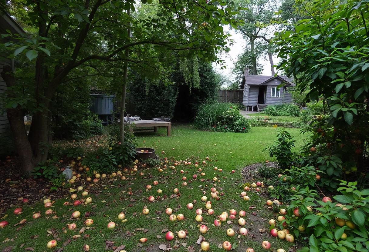 A lush green backyard is covered in fallen apples, scattered across the grass